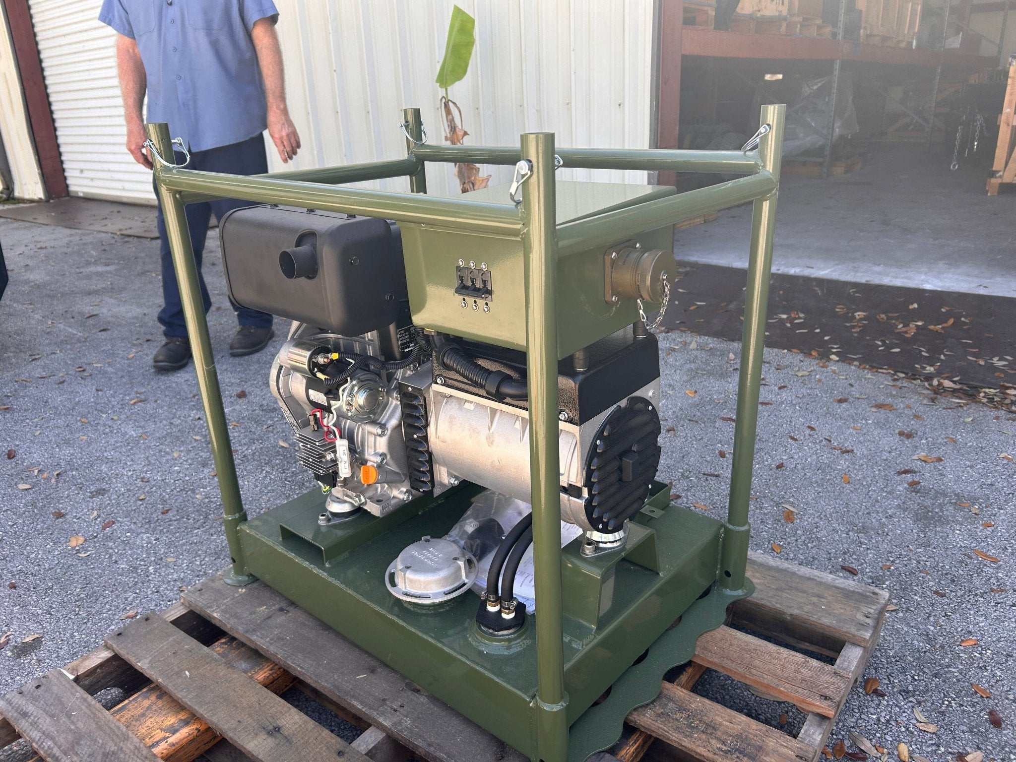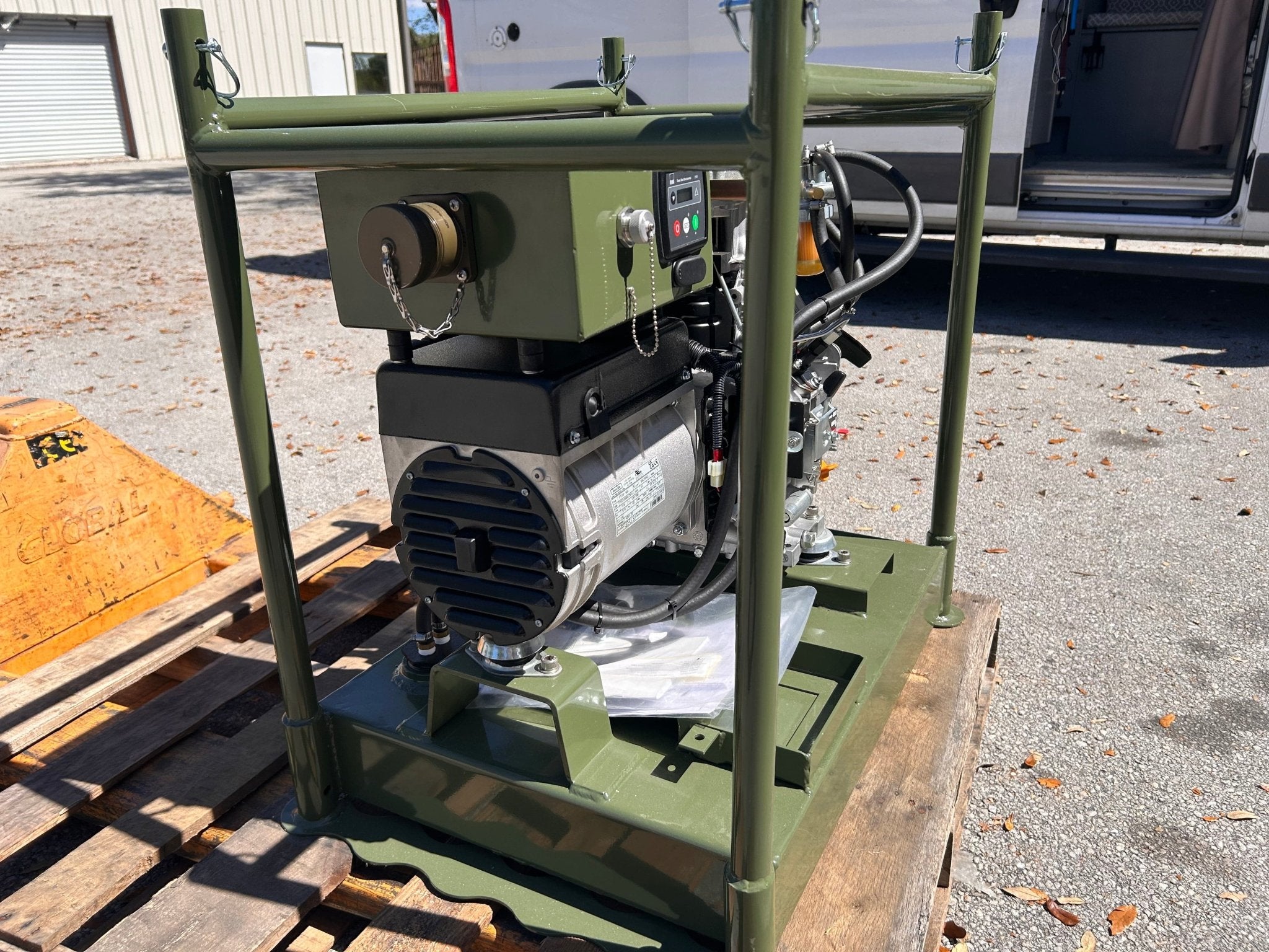 Originally designed for military-style field use, this generator features a heavy-duty roll cage frame that protects the generator and allows units to be stacked safely during transportation or storage. Anti-vibration mounts positioned between the generator set and the frame help reduce mechanical stress and improve stability during operation.