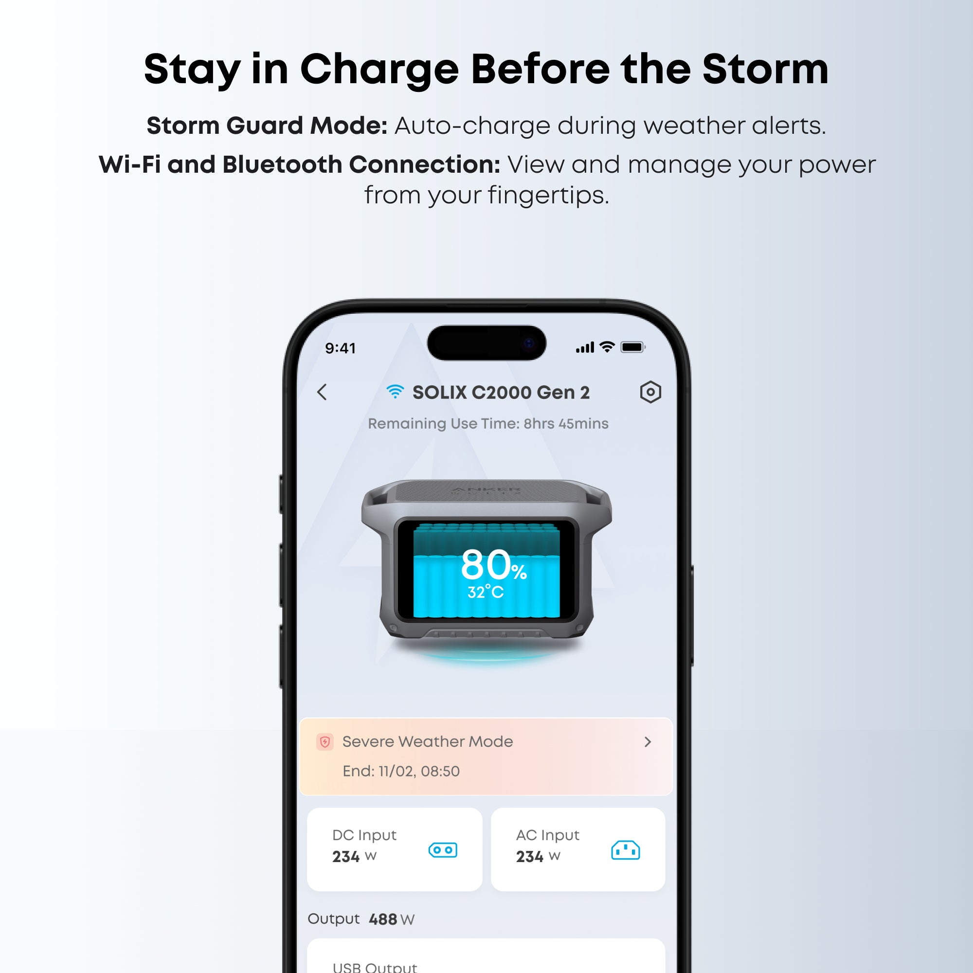 - Smart App Control: Check status, customize outputs, and track energy usage from anywhere using the Anker SOLIX app via Wi-Fi or Bluetooth.