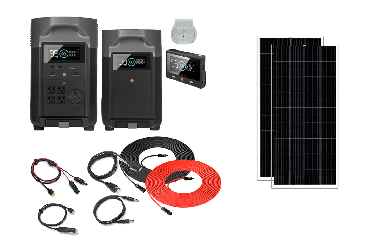 This complete power system includes both the New EcoFlow Delta Pro, One Delta Pro Extra Battery, and 400 to 1600 Watts of Solar Panels. This 7,200 Watt-hour complete solar generator system provides plenty of power to keep your products running 24 hours per day. Choose from the four options on this page of 400, 800. 1200 or 1600 Watts of solar panels.