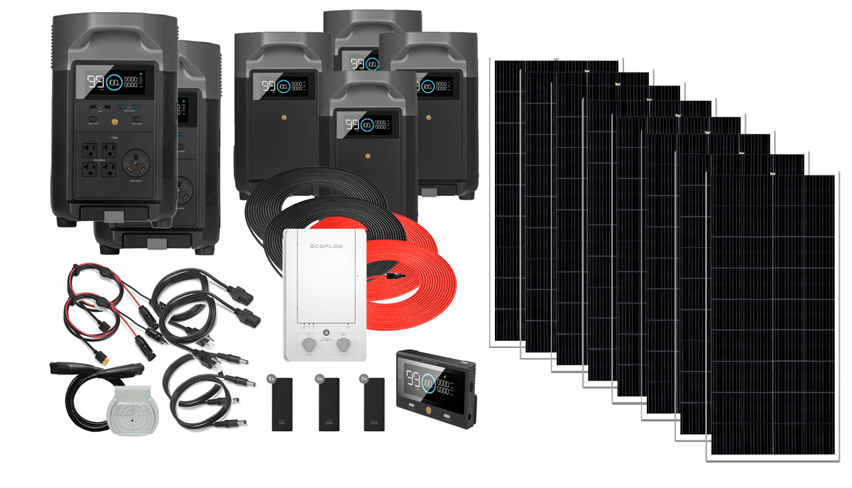This complete custom 7,200W, 21,600 Watt-Hour complete solar system comes complete with everything you need to start running your solar power system. With 21.6KWH of battery and 2680 watts of solar, you are set to power just about anything. Save big with this custom complete setup. Your complete solar generator system with the 2 included Delta Pro units and 4 Delta Pro extra batteries is a complete power station to run your off-grid home or keep you fully prepared for an emergency.
